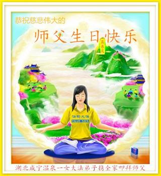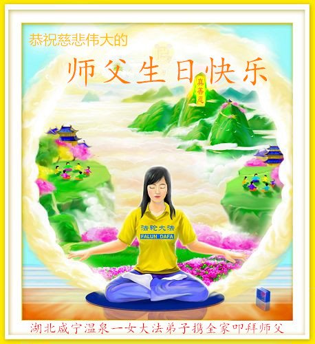 湖北省咸宁温泉一女大法弟子携全家恭祝慈悲伟大的师父生日快乐!