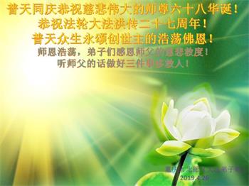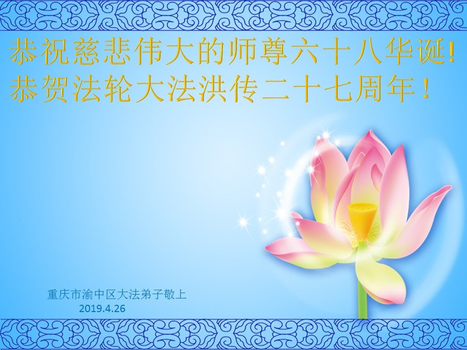 【明慧网二零一九年五月九日】 重庆市渝中区大法弟子恭祝慈悲伟大的师尊华诞!庆祝法轮大法洪传二十七周年!