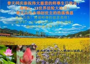 恭祝慈悲伟大的师尊生日快乐!世界法轮大法日快乐!师尊辛苦了!重庆美莲学法小组弟子叩谢师恩! 重庆市万州区开莲一大法弟子庆祝世界法轮大法日!恭祝师尊生日快乐!