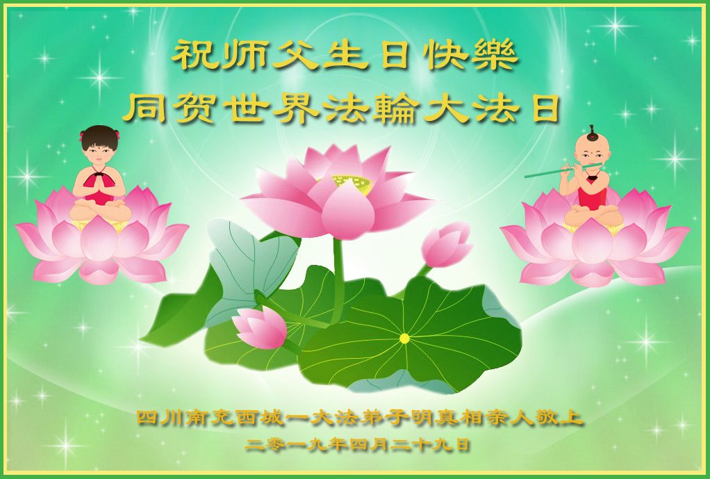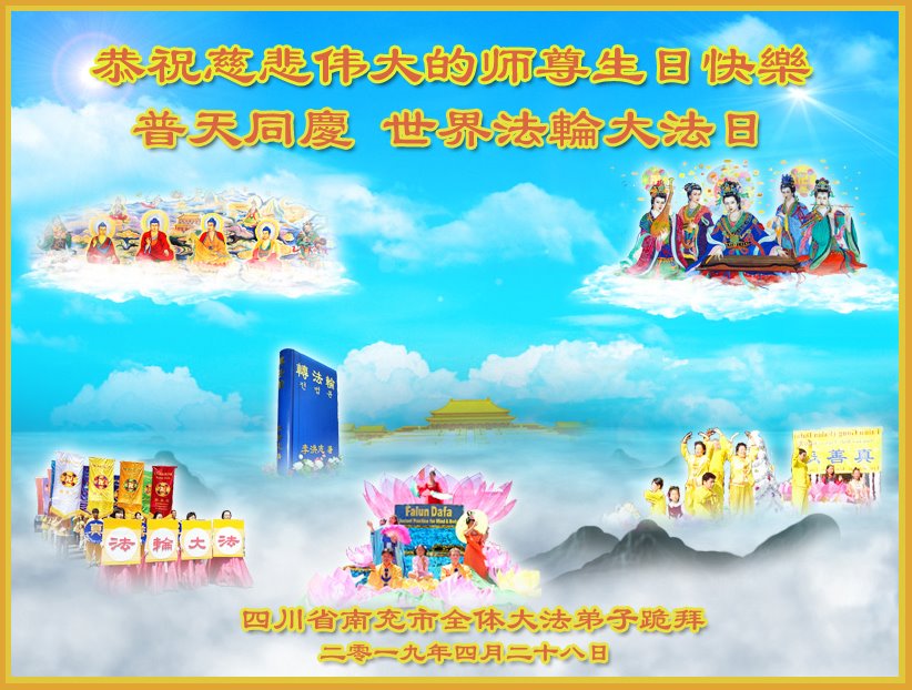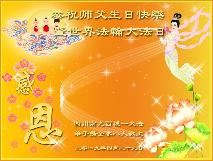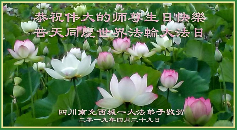四川南充西城一大法弟子明真相亲人恭祝师父生日快乐!同贺世界法轮大法日! 二零一九年四月二十九日 四川省南充市全体大法弟子恭祝慈悲伟大的师尊生日快乐!