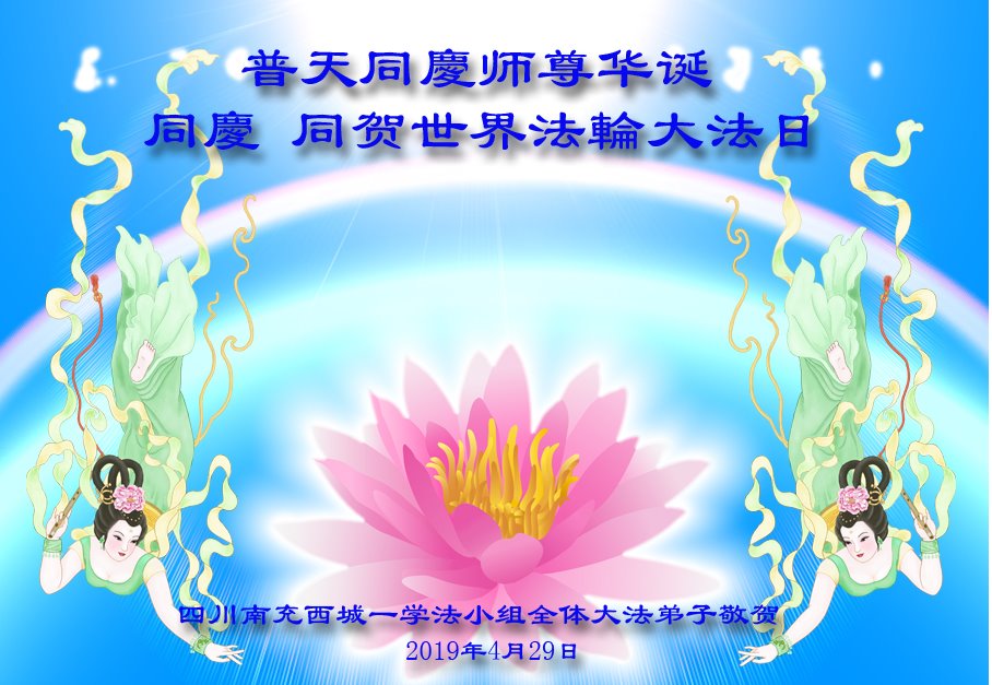 四川南充西城一大法弟子恭祝伟大的师尊生日快乐!普天同庆世界法轮大法日 二零一九年四月二十九日 四川南充西城一学法小组全体大法弟子恭贺师尊华诞!