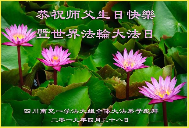 四川南充西城全体大法弟子恭祝师父生日快乐!普天同庆世界法轮大法日! 二零一九年四月二十八日 四川南充西城一大法弟子恭祝师父生日快乐!暨法轮大法洪传世界!