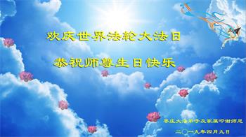 时间过的真快,转眼又一年,又到了五·一三世界法轮大法日,也是师尊华诞。弟子恭祝师尊生日快乐!师父您辛苦了!弟子感恩师尊的慈悲救度,能成为您的弟子感到无比的荣耀,您让我懂得了人生的真正意义返本归真,您为弟子承受了太多太多,弟子无法用人间的语言表达,唯有修好自己,多学法,多救人,按照法的要求做,实修自己,跟师父回家。 中国大陆山东烟台市龙口市大法弟子 二零一九年四月二十日 山东烟台市龙口市大法弟子恭祝师父生日快乐!