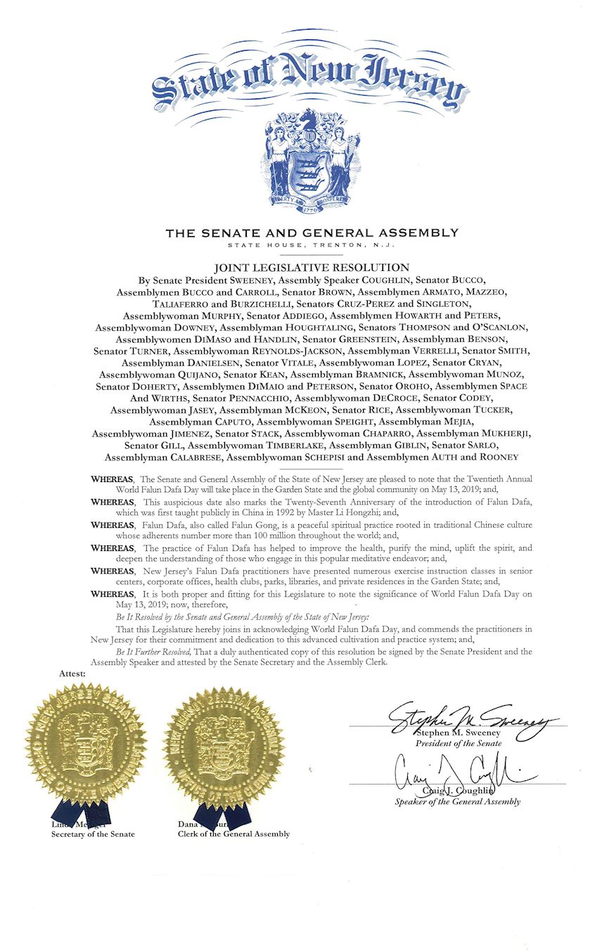 | 【明慧网二零一九年五月九日】在二零一九年世界法轮大法日到来之际,美国新泽西州参、众议院发表联合决议,庆贺第二十届世界法轮大法日,并赞扬法轮大法有助于改善健康,净化思想,提升心灵,表彰新泽西州法轮大法学员在本州推广法轮大法的努力。 决议案是由州参议员布科(Bucco)发起,六十七位州参、众议员联署。 最后由参议院主席斯威尼(Stephen Sweeney)和众议院议长考夫林 (Craig Coughlin)联合签发。 决议案译文如下: 新泽西州参议院和众议院联合决议 联署人: (参议院主席)斯威尼(Sweeney),众议院议长考夫林 (Craig Coughlin) (参议员)布科(Bucco),(众议员)布科(Bucco)和卡罗(Carroll);参议员布朗(Brown),(众议员)阿玛图(Armato), 玛泽奥(Mazzeo), 塔里菲娄(Taliaferro),布尔齐凯利(Burzichelli); (参议员)Cruz-Perez, Singleton,(众议员)墨菲(Murphy), (参议员)阿迪勾(Addiego), (众议员)哈沃斯(Howarth), 彼特斯(Peters), 唐尼(Downey), 豪塔林(Houghtaling), (参议员) 汤姆生(Thompson),欧斯堪容(O’Scanlon), (众议员)迪马叟(DiMaso), 汉得林(Handlin), (参议员) 格林斯坦(Greenstein), (众议员)本盛(Benson), (参议员) 特纳(Turner); (众议员)雷诺兹-杰克逊(Reynolds-Jackson),维拉里( Verrelli), (参议员)斯密思(Smith), (众议员)丹尼尔森(Danielsen), (参议员)维塔利(Vitale), (众议员)洛珀兹(Lopez), (参议员)科拉安(Cryan), (众议员)奎加诺(Quijano), (参议员) 肯恩(Kean), (众议员)布拉姆尼克(Bramnick), (众议员)姆努兹(Munoz), (参议员)多贺提(Doherty), 众议员)迪马尤(DiMaio) 和彼得森(Peterson), (参议员) 奥勒侯(Oroho), (众议员)斯贝思(Space)和维尔茨(Wirths), (参议员) 潘纳丘(Pennacchio),(众议员)迪克劳斯(DeCroce), (参议员)寇迪(Codey),(众议员)加赛(Jasey), 麦基翁(McKeon), (参议员) 莱斯(Rice),(众议员)塔克(Tucker), 卡普托(Caputo), 斯佩特(Speight), 梅嘉(Mejia), 基曼内兹(Jimenez), (参议员) 斯岱克(Stack), (众议员)查帕娄(Chaparro), 姆克基(Mukherji); (参议员) 基尔(Gill), (众议员)汀布莱克(Timberlake), 基布林(Giblin), (参议员) 萨洛(Sarlo), 卡拉布雷斯(Calabrese), (众议员)薛皮斯(Schepisi), 奥斯(Auth), 娄尼(Rooney) 鉴于,新泽西州参议院和众议院欣喜地注意到第二十届世界法轮大法日将于二零一九年五月十三日在花园州和全球社区举行; 鉴于,这个吉祥的日子是为了纪念李洪志大师在二十七年前在中国开始首次公开传授法轮大法; 鉴于,法轮大法也被称为法轮功,是一种植根于中国传统文化的和平精神实践,在全世界的信仰人数超过1亿; 鉴于,法轮大法的实践有助于改善健康,净化思想,提升心灵,使参与这一大众冥想努力的人加深对生命的理解; 鉴于,新泽西州法轮大法学员在花园州的老年中心、企业办公室、健身俱乐部、公园、图书馆和私人住宅举办了许多学习班; 鉴于,本立法机构在二零一九年五月十三日注意到世界法轮大法日的重要性,因此,现在, 由新泽西州参议院和众议院联合决议: 本立法机构特此共同表彰世界法轮大法日,并赞扬新泽西州的修炼者对这个高级修炼体系的专注和奉献精神;并且, 进一步决定,经由参议院议长和众议院议长签署并由参议院秘书和众议院秘书证明,经正式认证的此决议版本。 参议院议长斯威尼(Stephen Sweeney)(签字) 众议院议长考夫林 (Craig Coughlin)(签字) |