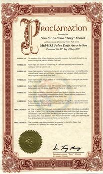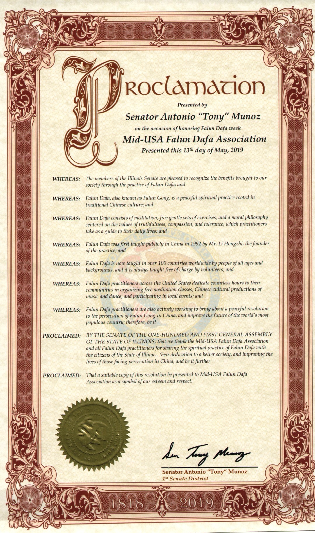| 【明慧网二零一九年六月五日】为庆祝法轮大法日和感谢法轮功学员为社会做出的贡献,美国伊利诺伊州州参议员安东尼奥·穆尼奥斯(Antonio Munoz)代表伊州参议院于2019年5月13日世界法轮大法日向美中法轮大法学会发出褒奖,祝贺“法轮大法周”。 褒奖译文如下: 褒奖伊利诺伊州州参议员安东尼奥·穆尼奥斯(Antonio Munoz)代表伊州参议院于2019年5月13日世界法轮大法日向美中法轮大法学会发出褒奖,祝贺“法轮大法周”。 鉴于:伊利诺伊州参议院成员荣幸地见证了法轮大法给我们的社会所带来的益处。 鉴于:法轮大法,又称法轮功,是根源于中国传统文化中的一个平和的精神信仰。 鉴于:法轮大法是包含着打坐在内的五套柔和的功法,修炼者把以“真、善、忍”价值为核心的道德哲学作为日常生活的指导。 鉴于:法轮大法最初由创始人李洪志先生于1992年在中国传出。 鉴于:法轮大法目前已经在全世界一百多个国家有不同年龄及阶层背景的人修炼,法轮大法一直由志愿者免费教授。 鉴于:美国各地的法轮大法学员通过为社区贡献无数的小时,组织免费功法学习班,展示中国文化的音乐及舞蹈表演,参与支持社区活动。 鉴于:法轮大法学员积极地通过平和的决议案要求停止在中国对法轮功的迫害,致力于改善这个拥有世界上最多人口的国家的未来。 伊利诺伊州101届州议会参议院特此褒奖:我们感谢美中法轮大法学会及所有法轮大法学员与伊州居民分享了法轮大法的精神信仰,感谢他们为成就更好的社会、改善在中国面临迫害的人们的生存做出的贡献。 特此褒奖美中法轮大法学会以示我们的钦佩与敬重。