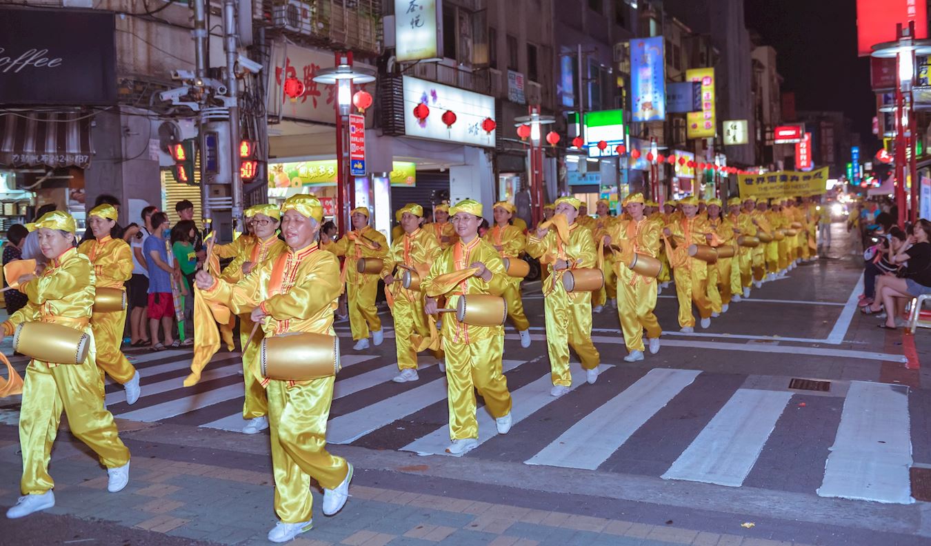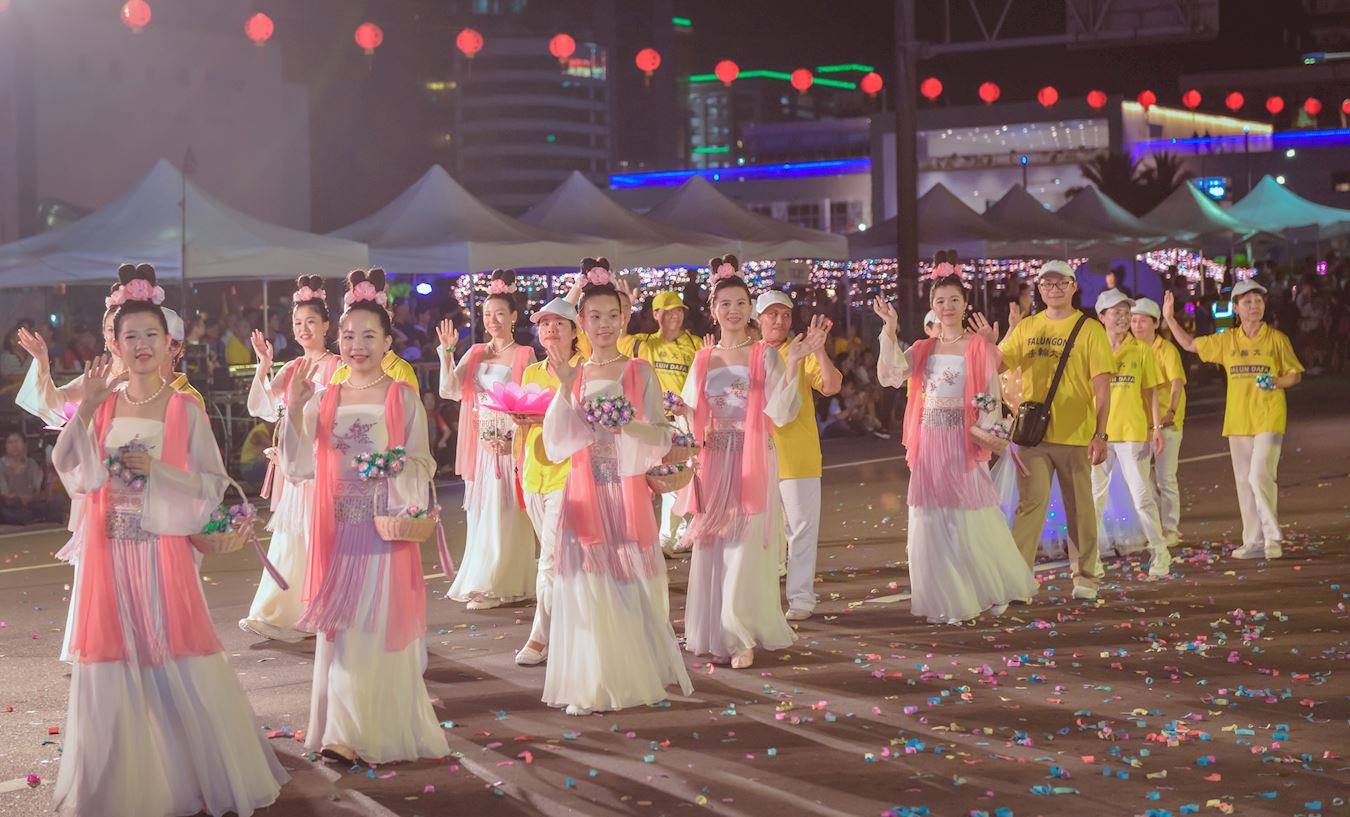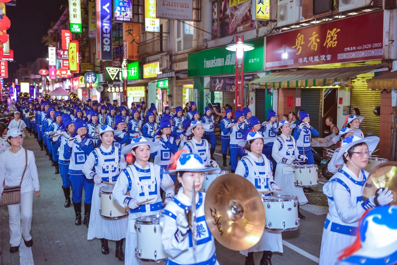 今年法轮大法花车比往年精致,尤其花车中间代表佛世界的光圈,学员在内演炼第五套功法,非常庄严殊胜,加上两旁炼功学员及莲花上的仙女,让许多民众看得目瞪口呆。沿途天国乐团步伐整齐,气势磅礴的鼓乐声,响彻云霄;腰鼓队英姿飒爽,鼓声隆隆,撼动人心。法轮大法几百人高素质的游行队伍,让围观民众看得合不拢嘴;有的民众双手合十,还有人鞠躬,也有人燃放炮竹,表示欢迎。 法轮大法队伍所到之处,民众争相拍照,有的热情挥手,许多民众竖起大拇指喊:“赞!”“法轮大法好”声也是此起彼落。基隆庙口夜市一名摊贩说:“你们最棒!”还有民众说:“你们是第一名!”也有全家人一起喊:“加油!”“法轮大法好!” 中场休息时,几百名法轮大法学员集体炼功。一名来自中国上海的年轻人,看到法轮大法队伍很震撼!学员告诉他“天安门自焚案”是谎言,法轮功弘传一百多个国家和地区,只有中国大陆镇压法轮功等,让他终于明白了真相。 最后游行结束通过观礼台时,市长林右昌对法轮大法队伍热情挥手,天国乐团通过时,他鞠躬表示感谢,对法轮大法游行队伍的肯定,溢于言表。