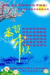 我本俗世一粒子,幸遇师尊来普度, 为谢师尊救度恩,努力做好三件事, 修出慈悲大善心,讲清真相救众生。 天津地区农村大法弟子恭祝慈悲伟大的师尊中秋节快乐!