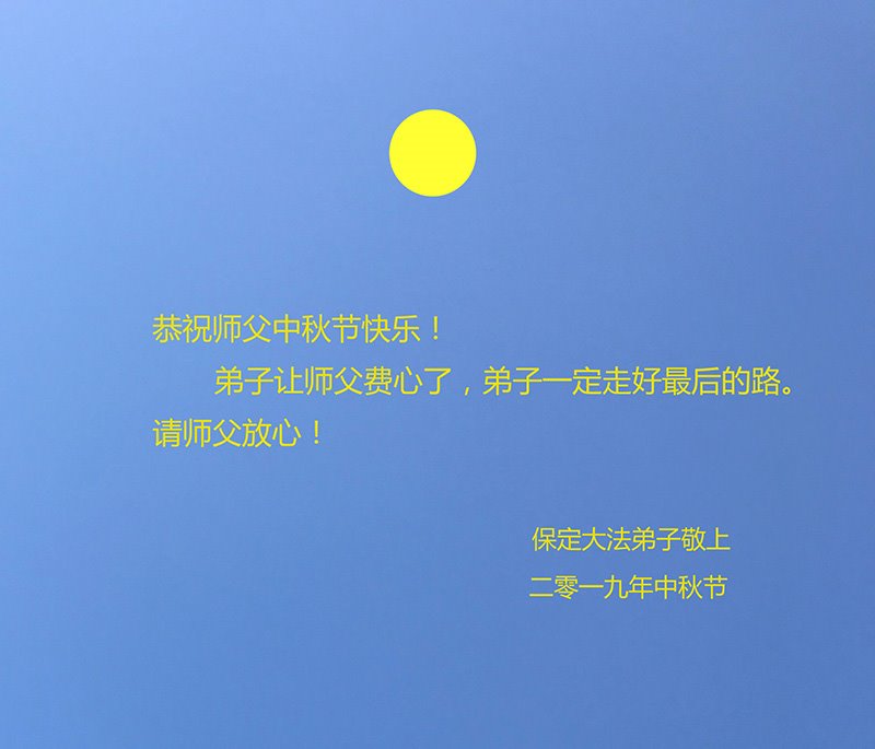 【明慧网二零一九年九月十日】 河北省保定市一大法弟子全家恭祝慈悲伟大的师父中秋节快乐!
