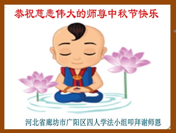 值此中秋来临,弟子们恭祝慈悲伟大的师尊中秋快乐!不辜负师尊对弟子们的无限期盼,珍惜时间,多救人! 河北廊坊九人学法小组大法弟子恭祝慈悲伟大的师尊中秋节快乐!