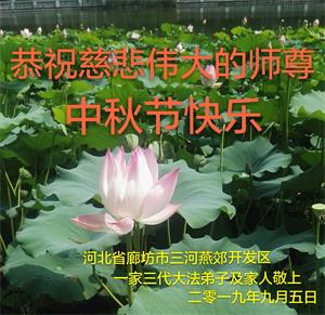 一家三代大法弟子及家人敬上 二零一九年九月五日 河北廊坊市文安全体大法弟子恭祝师父中秋快乐!