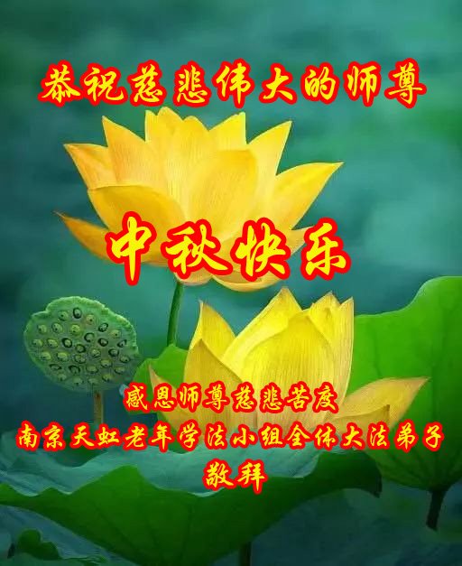 恭祝慈悲伟大的师尊中秋快乐! 我们想念师尊,盼望师尊早日回来。师尊辛苦了!我们一定好好修炼,做一个师尊所要的合格的弟子。 江苏省南京天虹老年学法小组全体大法弟子恭祝师尊中秋快乐!