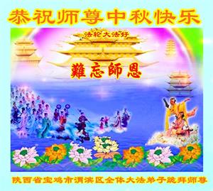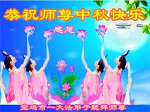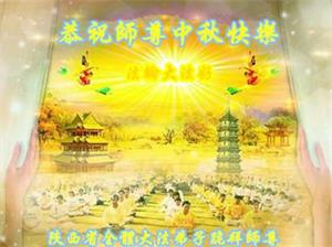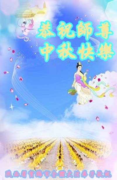 在这宝贵的时间里,弟子一定牢记师尊的教诲,认认真真学好法,时时处处向内找,踏踏实实的救人,兑现下世前的誓约,不让师尊失望,随师回家园! 弟子跪拜师尊!合十! 宝鸡市姜谭路一大法弟子全家敬呈! 陕西省宝鸡市全体大法弟子恭祝慈悲伟大的师尊中秋快乐!