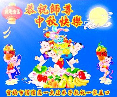 在正法進程進入法正人间之际,弟子们一定紧跟师尊正法進程,尽管邪恶仍然伺机迫害,但弟子们一定牢记师尊教诲,及时用大法法理归正自己,不给邪恶可乘之机,不能让邪恶再利用众生对大法犯罪,从而毁灭众生。弟子们整体配合不分地域,把明慧编辑部的《通告》及时传递给每一个世人,把大法的福音传递给每一个有缘人,使他们有机会为自己选择一个美好的未来,希望他们能够有机缘得到大法的慈悲救度,希望更多的众生能够進入未来新纪元! 谢谢师尊!师尊您辛苦了!弟子们再次叩谢师尊慈悲救度之恩! 陕西省全体大法弟子敬呈! 陕西省宝鸡市渭滨区一大法弟子全家五口恭祝慈悲伟大的师尊中秋快乐!