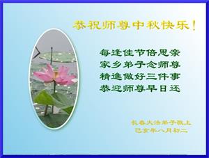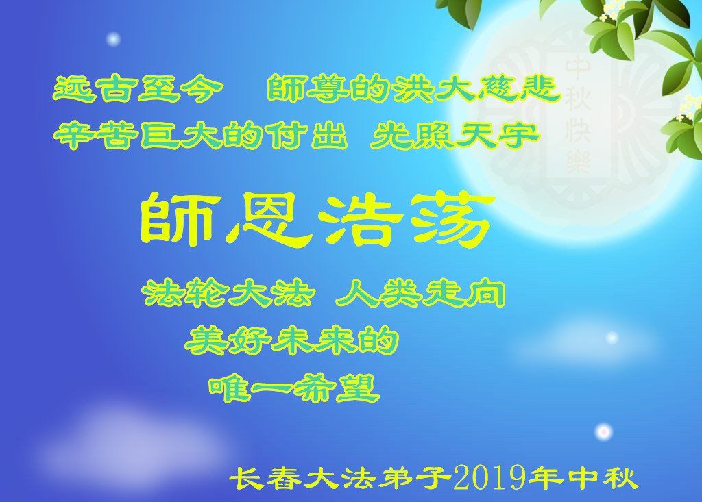 惟愿师尊笑正法二十载, 师尊操尽心, 带着弟子往前走, 弟子紧紧跟 尽管修的不精進, 师尊不嫌弃 二十年熔炼心更坚, 惟愿师尊笑 祝师尊中秋快乐! 吉林省长春市九台区一大法弟子 2019年9月1日 吉林省长春一大法弟子恭祝师尊中秋快乐!