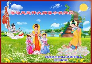 师父您好,师父辛苦了!谢谢师父的慈悲救度。弟子一定牢记师尊的教诲,遇事向内找,放下一切人心恶念,踏踏实实去做好三件事,修好自己,多救人,跟师父回家。 2019年9月4日 河北沧州全体大法弟子恭祝师父中秋快乐!