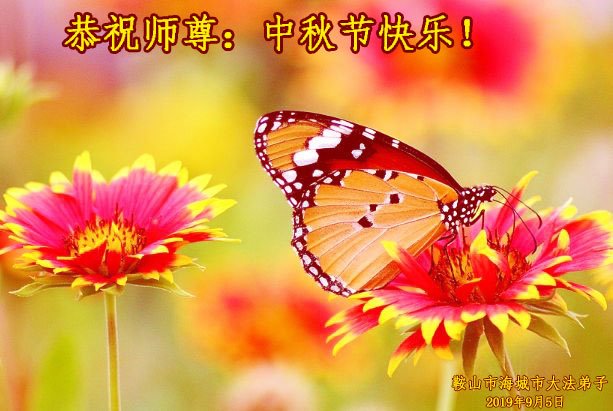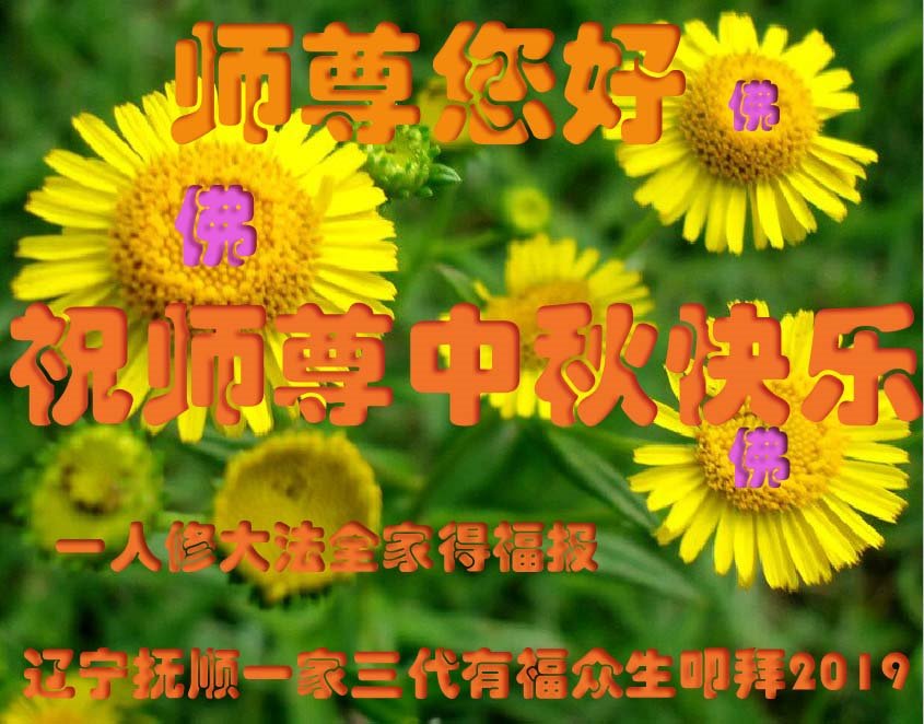 师父您好: 弟子要谨记师尊的法理。看淡、看清、放下、清除名、利、情。胸怀“圆满上苍穹”的大志。正念强、多救人,让师尊多一份欣慰。祝师尊中秋快乐! 辽宁抚顺大法弟子敬拜 2019年9月3日 辽宁抚顺一法轮大法弟子祝师尊中秋快乐!