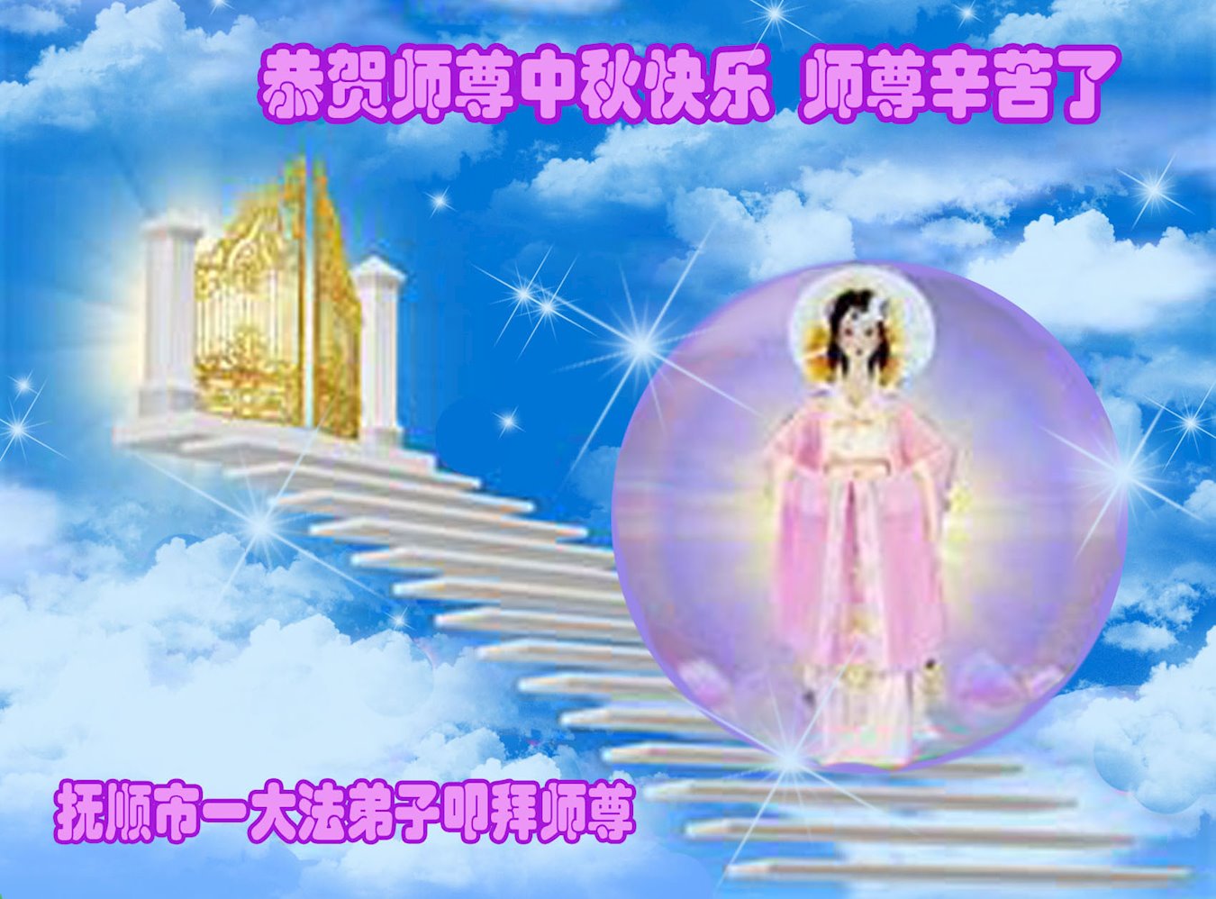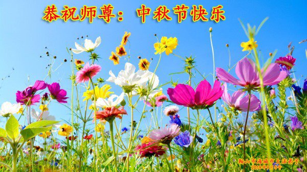 在中秋节来临之际,弟子叩拜恩师,恭祝师父中秋节快乐!心中充满着对师父的无限感恩,决不辜负师父对弟子的殷切希望,踏踏实实的修好自己,在证实法的路上多救人,走好最后的修炼之路,完成使命,圆容整体,共同精進,圆满随师还。 辽宁抚顺法轮大法弟子恭祝师尊中秋快乐!