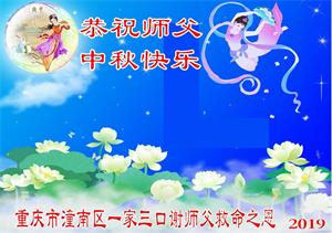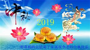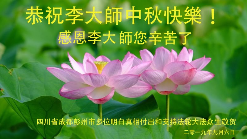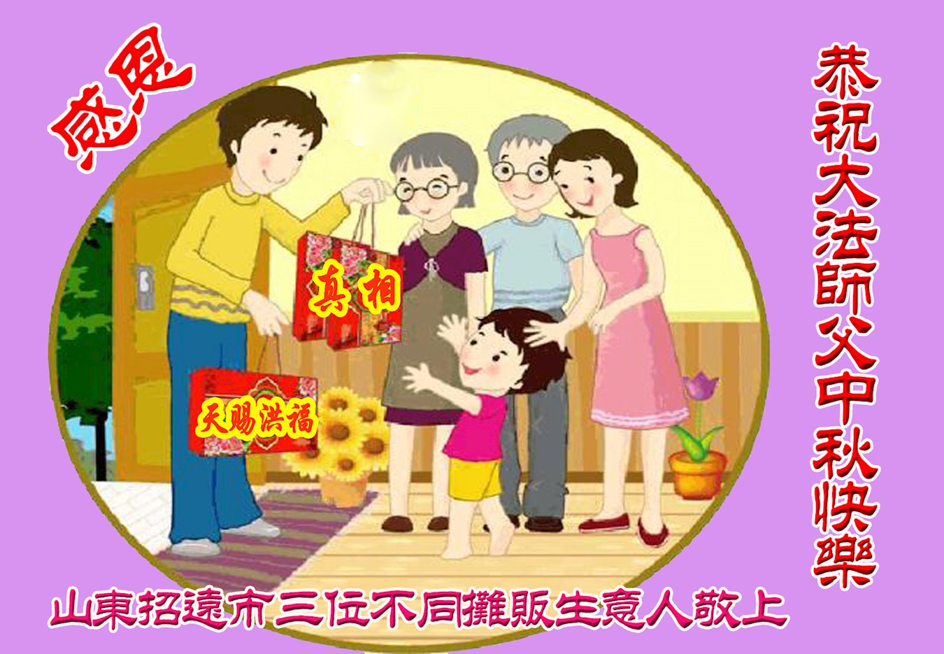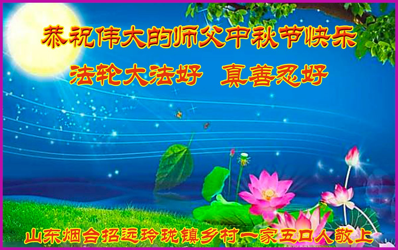 | 【明慧网二零一九年九月十日】法轮大法在世间洪传二十七年,使修炼人明法理,得真经,顶着恶浪在助师正法中越走越坚定,大法也造福于明真相的众生。中秋节到来,明慧网收到了中国大陆许许多多在大法中受益的民众给大法师父发来的贺信,表达他们对师父发自内心的感恩!敬祝李大师中秋节快乐! 山东招远市市民表示:我最爱看法轮功真相资料,我身边的大法弟子都是好人,教人做好人的功法就是正法。 哈尔滨一位大法弟子的家人说:“作为大法弟子的家人我们很自豪,很幸运能得到李大师的慈悲救度和保护。我们非常支持亲人修炼,并维护大法及帮助讲真相。” 吉林省柳河县一老兵敬祝伟大的李大师中秋快乐!我是吉林省柳河县一九四九年前的老兵,我天天都在念“法轮大法好,真善忍好”。现在无病一身轻。谢谢李大师! 祝您中秋快乐!永远快乐! 吉林省柳河县一老兵敬上 山东省招远市一明真相的世人敬祝李大师中秋节快乐!我最爱看法轮功真相资料,因为那上面说的全是真话,还教人做好人。我身边的大法弟子都是好人,教人做好人的功法就是正法,不是邪法。李大师是来救人的,我很敬畏大法师父!我女儿也相信法轮大法好,她的生意很赚钱。我的身体也越来越好。 感谢李大师的救度之恩!祝李大师中秋节快乐! 南京市明真相世人恭祝李大师中秋快乐!山东省临沂市一大法弟子全家四十多口人祝师尊中秋快乐!我们沐浴在师尊的慈悲里,修大法真正的使我们改变了命运! 我家的修炼人二十多年来身体健康,没吃一片药,原来有的病在修炼不久师尊就统统都给去掉了。 就连未修炼的家人也都在大法中受益: 姥姥今年九十六岁,延寿十多年了。她老人家在八十来岁时的一天,看见自己拿着白布躺在那里,也就是元神走了,她说是师父把她叫了回来。 我的丈夫未修炼法轮功,二十二年来只有一次因肾结石去了医院。把结石打掉回家后也没吃药,休息几小时就上班去了。 修炼前我和丈夫一天到晚打架,现在我俩相敬如宾,给了长辈和孩子一个温馨的家庭。我得法后明白了人与人之间的因缘关系,最主要的是明白了人生的目地,知道了待人要宽容。 无法用笔墨描述感恩师尊的心!只有在这最后珍贵的时间里修好自己,多多救人以报师恩。中秋月圆之际,我们全家四十多口人祝师尊中秋快乐! 合十叩拜师尊! 安徽省淮南市寿县一大家族六十八人恭祝慈悲伟大的师父中秋节快乐!安徽省淮南市寿县一大家族中的兄弟姐妹大法弟子携明白真相的老、少四代六十八人恭祝慈悲伟大的师父中秋节快乐! 中秋 天上月儿圆 地上人不圆 人逢佳节倍思亲 盼望师父回故园 师父啊,我们想念您! 哈尔滨明真相的大法弟子家人恭祝李洪志大师中秋节快乐!作为大法弟子的家人我们很自豪,很幸运能得到李大师的慈悲救度和保护。我们早已明白真相并做了“三:退.”,也经常诚念“法轮大法好,真善忍好”,现在我们身心健康,家庭和睦幸福。我们亲眼见证了亲人修炼大法的美好神奇,非常支持亲人修炼,并维护大法及帮助讲真相救人。我们坚信邪不压正,法轮大法是高德大法,盼望法正人间早日到来! 真诚感谢李大师救度之恩!大师辛苦了! 黑龙江哈尔滨明真相的大法弟子家人 敬上 二零一九年八月二十二日 吉林省通化柳河县一工程师敬祝李大师中秋节快乐!我代表女儿和外甥女向大法师父问好! 一人炼功全家人受益,我母亲是炼法轮功的,我们都得到福报。我们经常念“法轮大法好,真善忍好”,按照真善忍做好人。我的工作顺利,外甥女考上重点高中,背《论语》、部份《洪吟》,有时间看大法书。我五岁女儿身体健康,活泼可爱,能背几段《洪吟》、唱大法弟子创作的歌曲,还给师父磕头。我们时刻沐浴在佛恩浩荡中! 重庆市潼南区一家三口恭祝师父中秋快乐!感谢师父救命之恩! 北京昌平一大法弟子全家恭祝师尊中秋节快乐!慈悲伟大的师父您好!您辛苦了!弟子全家和明真相的姐姐妹妹恭祝您中秋节快乐!我们无比感谢您的慈悲救度,谢谢您! 希望更多的中国人早日明白法轮大法的真相,摆脱邪*党-的控制,过上真正的幸福生活! 吉林省通化柳河县九十四岁的老人敬祝李大师中秋快乐!我今年九十四岁,原来有心脏病、高血压,我没有文化,心存正念,每天净面漱口后,散盘结印念:“法轮大法好,真善忍好!”已念12年了。现在我耳聪眼明腰直,身体特别的健康,能干很多的家务活。谢谢李大师给我新生,我特别想念您,我好好活着,等您回来了我去面谢! 吉林省通化柳河县九十四的老人敬上 山东招远三位生意人恭祝大法师父中秋快乐!他们是三位不同摆摊做买卖的生意人,他们委托大法弟子转达他们对大法师父的中秋祝贺!他们说,自从听了大法真相,看了大法资料,退出中共邪*党-组织后,生意红火,“我们从心里感谢李大师给我们的福份,我们真心相信法轮大法好!谢谢李大师!恭祝李大师中秋快乐!” 哈尔滨明真相家属恭祝李大师中秋节快乐!黑龙江哈尔滨大法弟子家属恭祝慈悲伟大的师尊中秋快乐!四川省开江县一大法弟子及一大家族明真相的世人恭祝师尊中秋快乐!河北阜平一大法弟子明白真相的女儿恭祝慈悲伟大的师尊中秋快乐!我是河北阜平一大法弟子明白真相的女儿。在中秋来临之际,祝大法师父中秋快乐!因为我看过大法书,明白大法是教人修心向善做好人的,所以我支持妈妈修炼,支持法轮大法,法轮