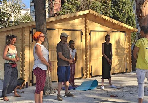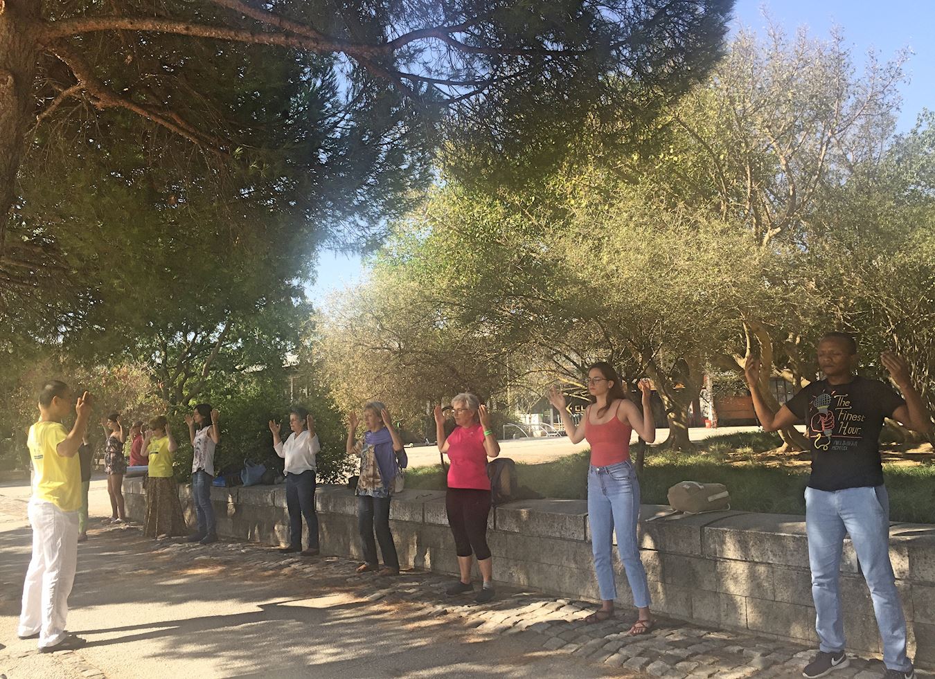 【明慧网二零一九年九月十日】二零一九年九月六日至八日,葡萄牙里斯本在五一广场举办展览会,当地法轮功学员也来此申请了展位,向民众传播法轮大法的美好,并揭露中共迫害法轮功的真相。许多民众当场学炼法轮功功法。 图1:二零一九年九月六日至八日,葡萄牙法轮功学员在里斯本举办展览会期间,也设立了展位,传播法轮功的真相。图中的法轮功学员正在演示功法。 |