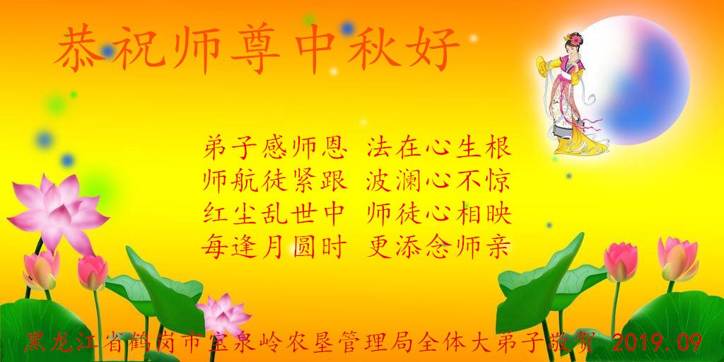 大陆出版发行行业的大法弟子叩谢师恩。恭祝慈悲伟大的师尊中秋快乐! 黑龙江省鹤岗市宝泉岭农垦管理局全体大法弟子恭祝师尊中秋好!
