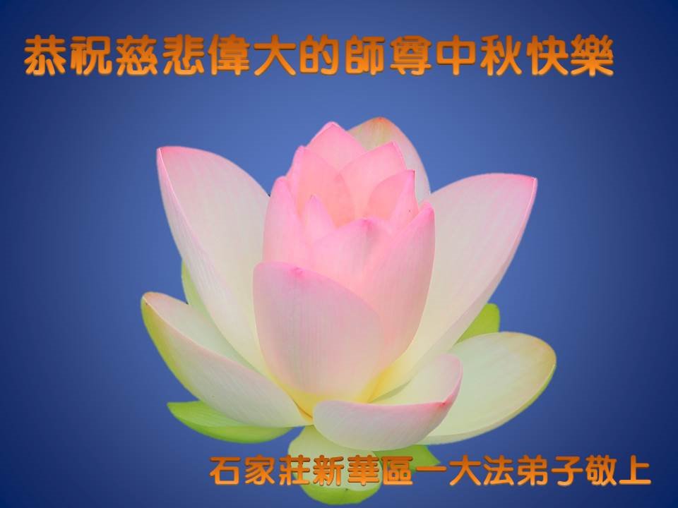 风风雨雨跟师父走过二十年正法路,感恩师父慈悲救度! 我们一定严格要求自己,做好三件事,学好法,发好正念,多救人,让师父多一些欣慰。直至功成圆满,跟师父回家。 恭祝慈悲伟大的师尊中秋快乐! 河北省石家庄西三教全体大法弟子敬上 二零一九年九月八日 河北石家庄一大法弟子恭祝慈悲伟大的师尊中秋快乐!谢谢师尊的慈悲救度!弟子一定修好自己,抓紧救人。