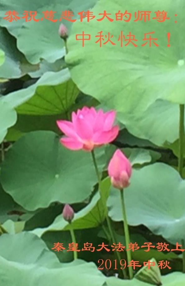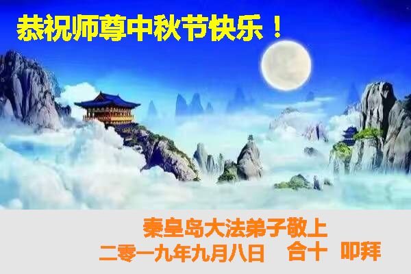 中秋节是中国大陆传统的团圆佳节,可是由于中共邪*党-残酷迫害法轮功,师尊在异国他乡,远离故土,不能回国与大陆的大法弟子相见,大陆的大法弟子都非常想念师尊。在传统佳节到来之际,秦皇岛市大法弟子恭祝师尊中秋快乐! 弟子们会更加努力的做好三件事,修好自己,找出不足,做好自己该做的,盼望与师尊早日相见。 秦皇岛市大法弟子敬上 二零一九年九月六日 河北省秦皇岛市大法弟子及家人恭祝师尊中秋快乐!