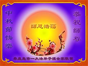 慈悲伟大的师尊您好,我们大陆大法弟子每逢节日都非常非常想念恩师,每当想起恩师为了救度苍宇众生与您的弟子,不知吃了多少苦,遭了多少罪,我们就心里难受泪流满面。我们作为大法弟子只有精進实修,做好三件事,在有限的时间里,抢人、救人、多救人,同时修好自己,兑现史前的誓约,圆满随师还。 河北秦皇岛大法弟子恭祝慈悲伟大的师尊中秋节快乐!