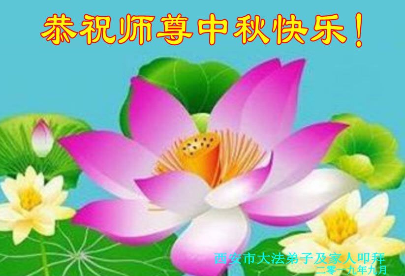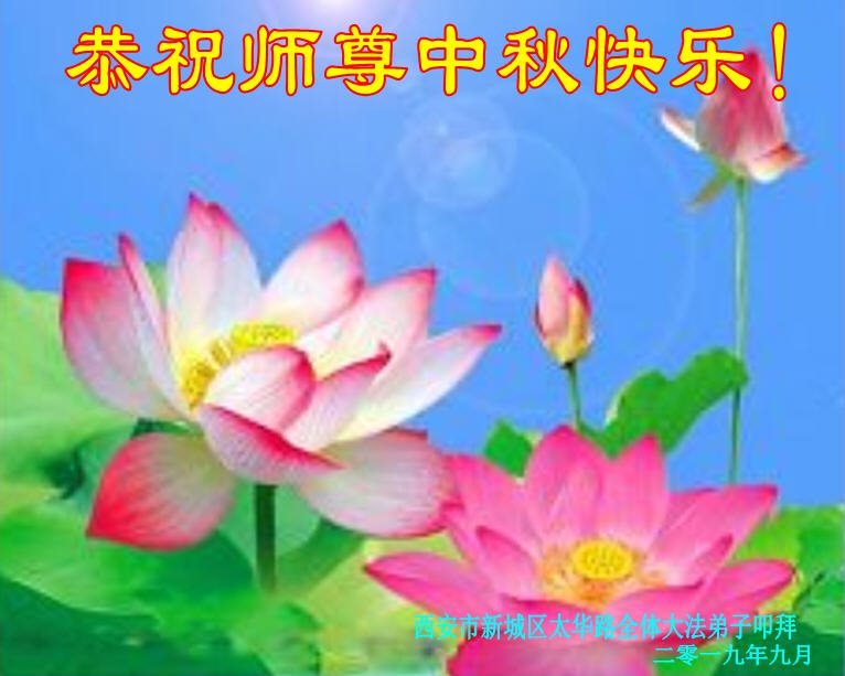 在这个敬谢神恩的传统节日里向师尊问好,无限感恩师父的慈悲苦度,恭祝慈悲伟大的师父中秋快乐!向伟大的师尊叩拜! 西安一大法弟子 2019年9月10日 陕西省西安市全体大法弟子恭祝师父中秋节快乐!