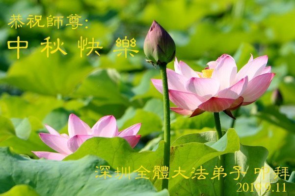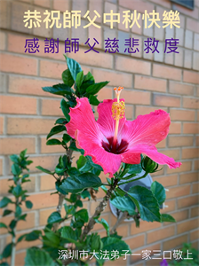 恭祝师父中秋快乐!谢谢师父的慈悲看护和救度,引导我能从新走回大法,真正的开始实修。我会抓紧时间,跟上大法進程,修去执着,做好三件事,跟您回家!我代表我们一家三口,叩谢师恩。 广东省深圳市盐田区全体大法弟子恭祝慈悲伟大的师父中秋节快乐!