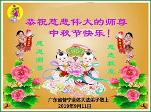 【明慧网二零一九年九月十三日】 广东省揭阳市普宁市全体大法弟子恭祝慈悲伟大的师尊中秋节快乐!感恩师尊慈悲救度!