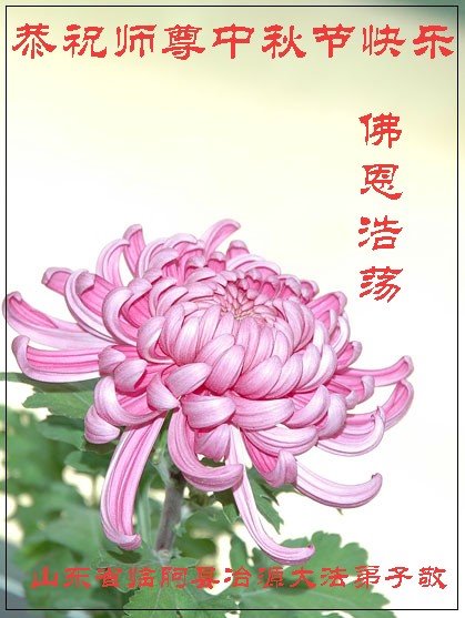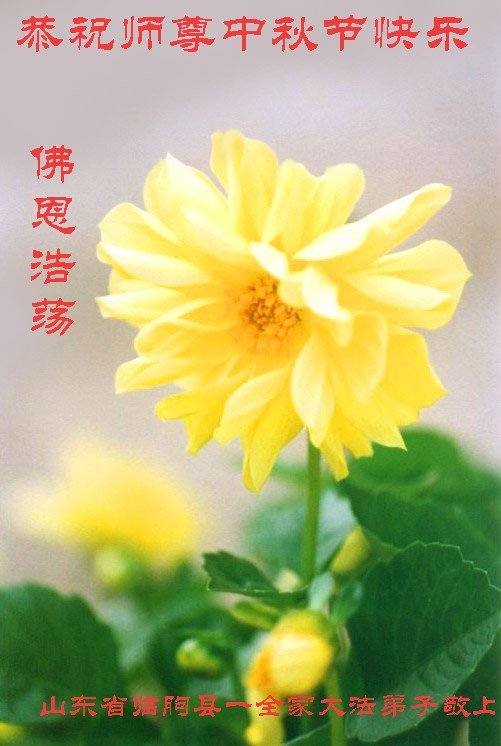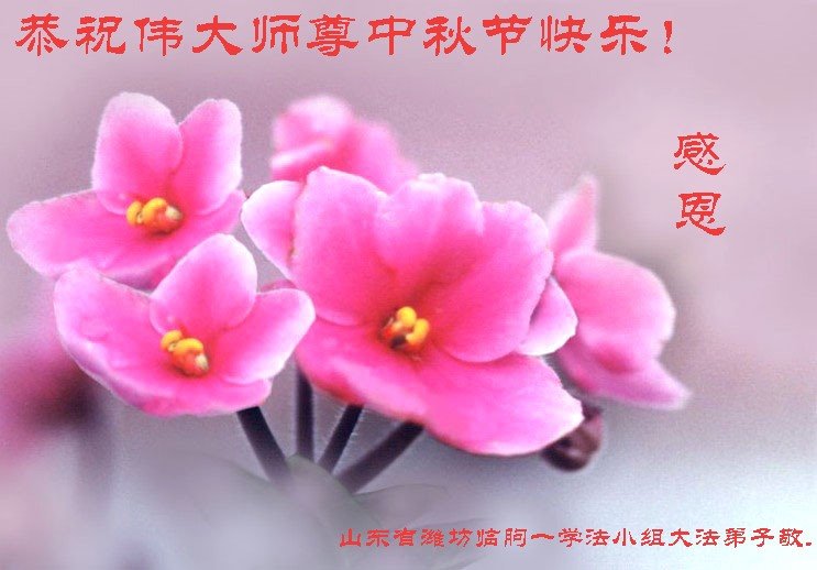 每逢佳节倍思亲,在中秋佳节到来之际,弟子们就特别想念师尊,在此弟子们叩拜慈悲伟大的师尊!恭祝师尊中秋快乐! 我们会谨记师尊的教诲,整体配合好,做好三件事,救度更多的众生,让师尊多一份欣慰,少一份操劳。合十! 山东省潍坊市临朐县一全家大法弟子恭祝师尊中秋节快乐!