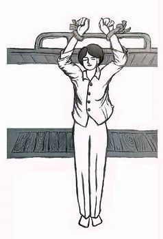 二零零四年九月十三日,夏宁被温泉派出所绑架到兴城看守所,遭暴力殴打,戴脚镣,“刀”铐(一种自动往肉里走的手铐),用木棒打,用大串钥匙猛击后背,上连铐,被迫害四天。 二零零八年三月十一日,夏宁在街上讲真相时,被城东派出所绑架到兴城看守所,遭殴打,在兴城810医院被野蛮灌食两次,非法关押十多天。非法送到马三家教养院,检查身体不合格后拒收。二零零八年五月十三日早晨,夏宁在家中被城东派出所绑架到马三家教养院,到马三家教养院后,才得知被非法劳教两年。两年中,夏宁几乎一直被吊铐在床上,差不多每天都在电棍电击和毒打中度过:不准睡觉,不让去厕所,不许洗漱。还被扒光衣服(只穿裤头)拽到满屋男警察的特管队,进行人格侮辱。教养院还对夏宁采用“抻刑”折磨,用两个铐子将夏宁的左手铐在床梁上抻着,再用布绳子将右手铐狠劲儿抻很远绑上。  马三家酷刑:抻刑(上大挂) |