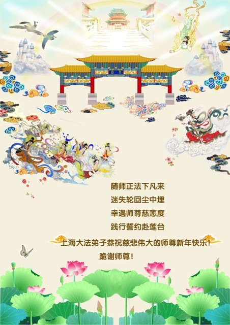 谢谢师父把弟子从地狱里捞起,时刻保护着弟子。在最新的一年里,在正法的最后阶段,我要多学法、学好法,多救人,跟师父回家。 上海全体大法弟子恭祝慈悲伟大的师尊新年快乐!