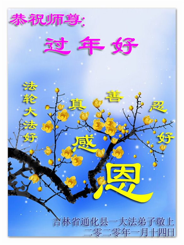 恭祝师尊过年好! 法轮大法好!真善忍好! 吉林省通化县一大法弟子敬上 二零二零年一月十四日 吉林省通化县一大法弟子恭祝师尊新年快乐!