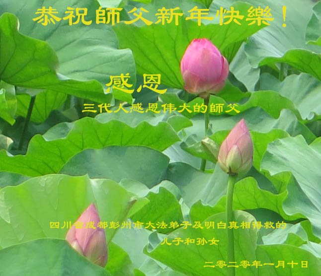 恭祝师父新年快乐! 三代人感恩伟大的师父! 四川省成都彭州市大法弟子及明真相得救的儿子和孙女敬上 二零二零年一月十日 四川省成都彭州市一大法弟子夫妻及全家人恭祝师父新年快乐!