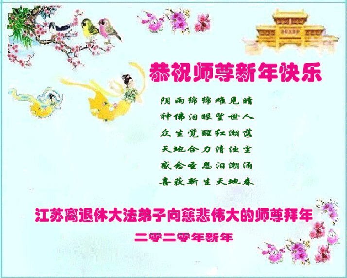 谢谢师尊一路保护,慈悲导航! 师尊正法承巨难 慈航苦度挽狂澜 甘露撒遍天地间 众生得度泪涟涟 正法洪势开新天 天上人间盼团圆 江苏离退休大法弟子向慈悲伟大的师尊拜年!恭祝师尊新年快乐!