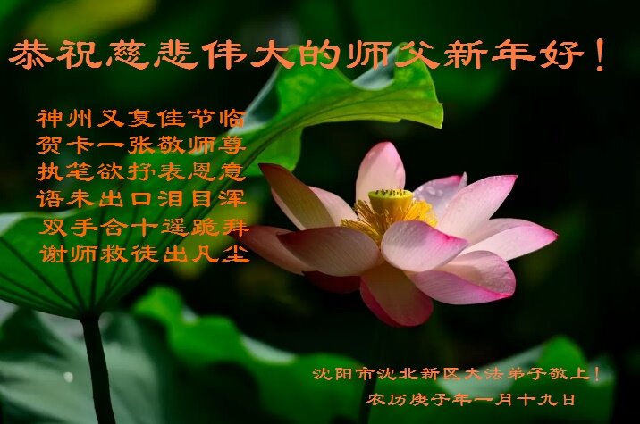 恭祝师尊新年快乐! 弟子们用语言无法表达对师尊的感恩,只能在最后的时刻,努力做好三件事回报师恩。 沈阳一学法小组全体大法弟子叩拜 辽宁省沈阳沈北新区一大法弟子恭祝慈悲伟大的师父新年好!