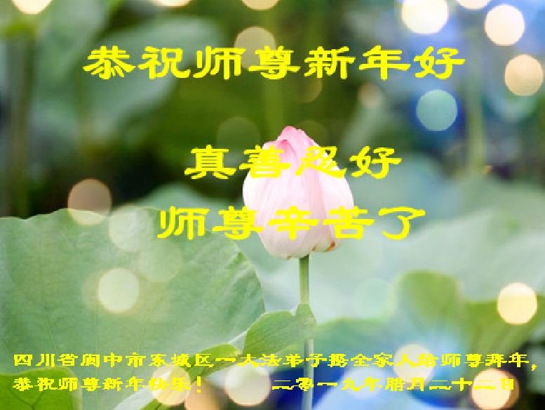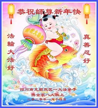 感谢师父的一路陪伴、慈悲点化、保驾护航!感谢大法给我们带来了健康的身心,给我们的家庭带来了一片祥和!感谢师父的慈悲教化与救度洪恩!在这辞旧迎新之际,我们大法弟子婆孙二人携带我们全家人包括儿、媳、亲朋给师父拜年!恭祝师父新年快乐! 四川省阆中市西城区大法弟子婆孙二人携全家人及亲朋叩拜!合十 四川省南充市阆中市东城区大法弟子一家三人给师尊拜年!恭祝师父您新年快乐!