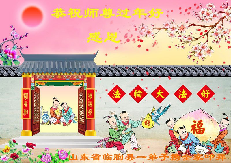 山东省潍坊市临朐县一大法弟子携全家恭祝师尊过年好!