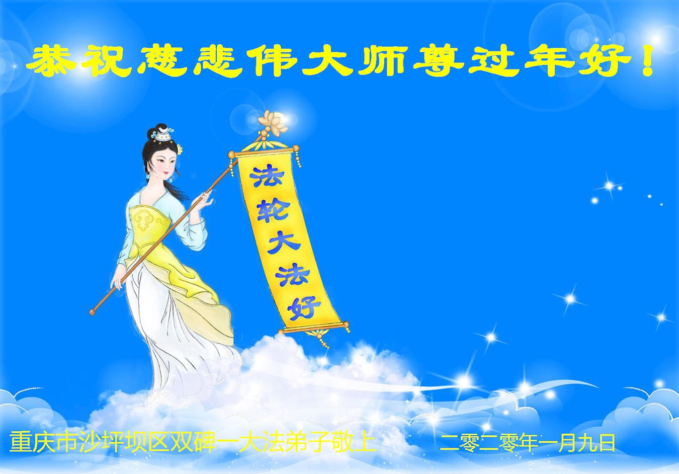 重庆市渝中区一学法组恭祝师父新年快乐! 师父好!师父辛苦了! 在新年到来之际,我们学法组向师父敬上一张小小的贺卡,恭祝师父新年快乐! 千言万语都无法表达我们对师父的感恩,唯有好好学法,修好自己,坚持做好三件事才对得起师父的慈悲救度。 请师父相信,我们会努力的! 二零二零年一月九日 重庆全体法轮大法弟子给伟大、慈悲的师父拜年!恭祝师父庚子年快乐!
