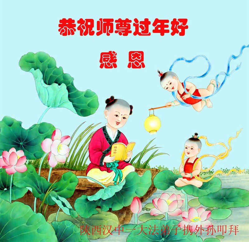 陕西省汉中一大法弟子携外孙恭祝师尊过年好!