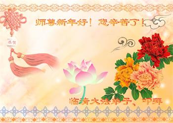贺卡敬师尊 略表弟子一片心 问声师尊新年好 弟子跪拜谢师恩 感恩师尊慈悲度 修炼路途师费心 弟子不忘师尊盼 修炼路上知精進 心中铭记真善忍 学好大法多救人 楼门庭院送真相 救度众生兑誓言 时时修心向内找 提高心性转观念 正念正行按法做 跟随师尊回天门 山东省威海市文登区一大法弟子恭祝慈悲伟大的师尊新年好!