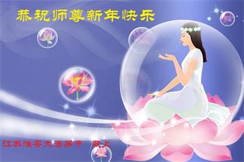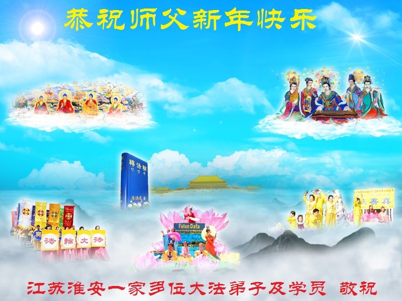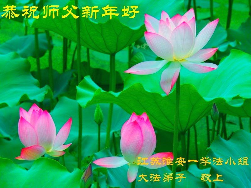 恭祝师尊新年好! 在新的一年里,我们要继续做好三件事,精進实修,惟愿师尊笑。 江苏省盐城市阜宁县全体大法弟子合十跪拜 江苏淮安一学法小组大法弟子恭祝师父新年好!