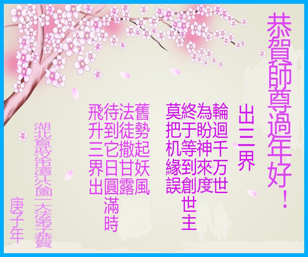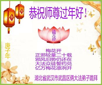武汉市汉阳区全体大法弟子恭祝慈悲伟大的师尊庚子年新年快乐! 湖北省武汉市汉阳区一大法弟子恭祝慈悲伟大的师尊庚子年新年快乐!