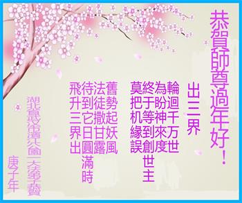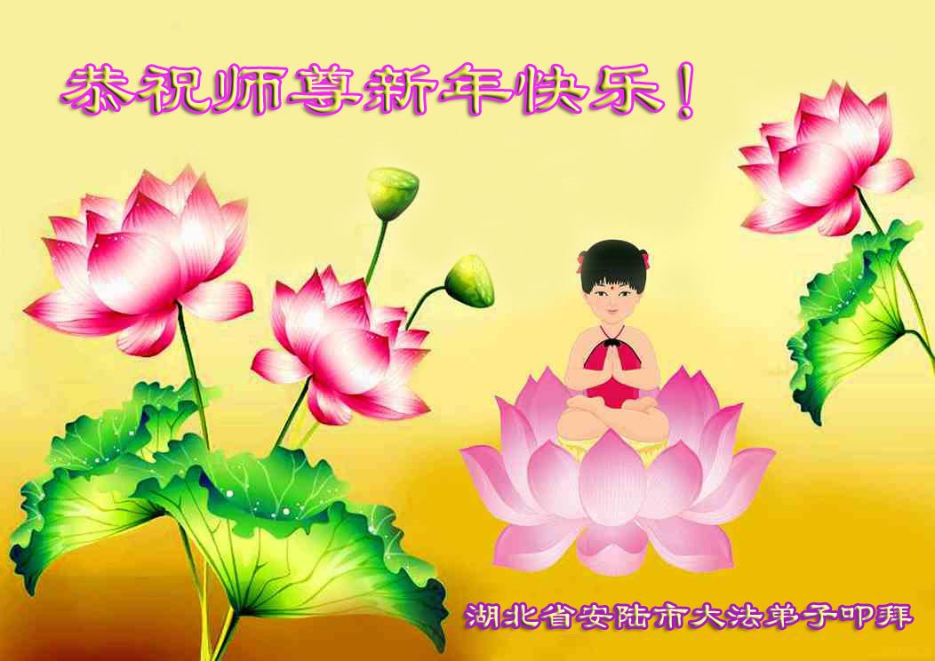 恭祝慈悲伟大的师尊过年好! 感谢恩师的保护救度之恩! 愿在新的一年里,更加精進,除邪恶,不懒惰,做好师尊要求的三件事,真正以神的状态慈悲善念救度更多众生,惟愿师尊笑。 湖北省麻城市大法弟子叩拜! 湖北省孝感市安陆市大法弟子恭祝师尊新年快乐!