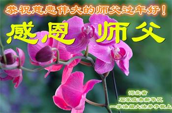 师父您辛苦了!河北省石家庄市桥西区一学法组大法弟子,给师父拜年啦!恭祝慈悲伟大的师父过年好!并祝愿师父新年快乐!感恩师父的慈悲苦度!在正法修炼的最后阶段,弟子们一定要更精進,修好自己,放下自我,圆容整体,做好三件事,多救人,兑现来世的誓约。 盼望慈悲伟大的师父早回东土中心之国! 河北省石家庄市长安区一家四口大法弟子恭祝师父新年好!