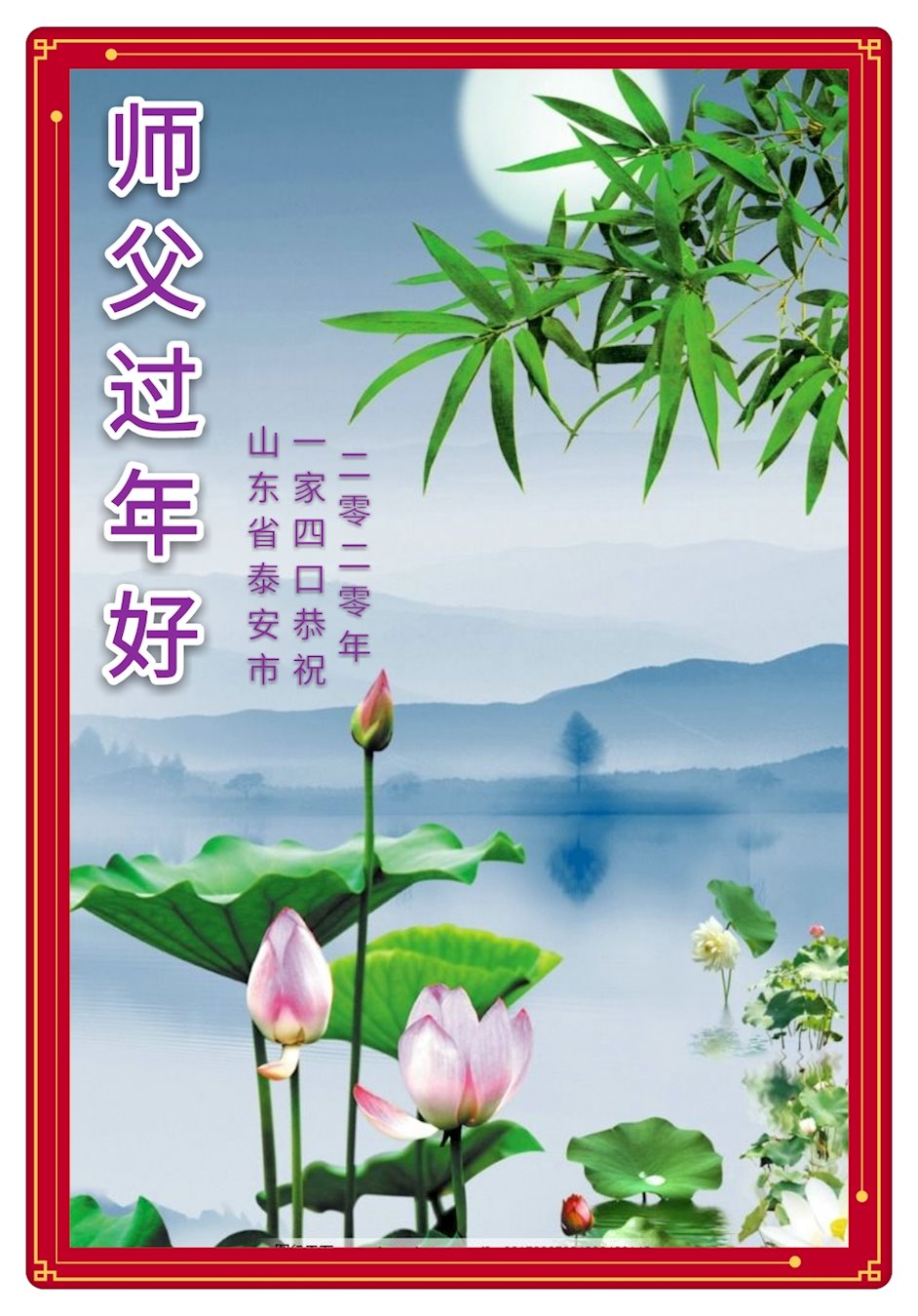 山东省泰安市一家四口大法弟子,恭祝慈悲伟大的师父过年好! 山东省威海市荣成市夫妻大法弟子恭祝师尊新年好!