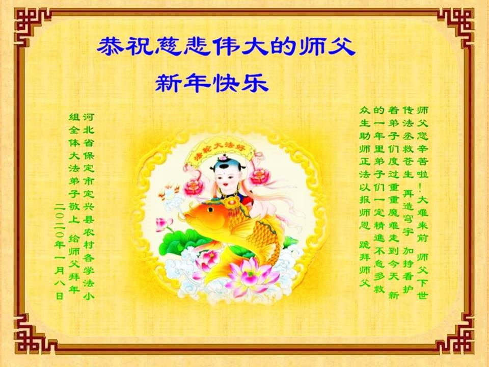 师父您辛苦了!我们眉山农村全体大法弟子想念师父,祝师父新年快乐! 2020年元月10日 河北省保定市定兴县农村各学法小组全体大法弟子恭祝慈悲伟大的师父新年快乐!