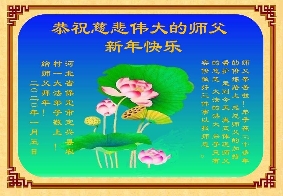 河北省保定市定兴县农村一大法弟子敬上 二零二零年一月五日 山东省滨州市博兴县农村一家六位大法弟子及家人恭祝慈悲伟大的师父新年快乐!