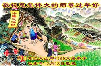 过大年了,千家万户沉浸在阖家团圆的欢乐之中,我们大法弟子知道:宇宙到了坏灭的最后阶段,苍宇众生处于毁灭的危难之中,为救苍宇众生,师父来人间传大法;为救苍宇众生,师父为众生承受业债巨难延续了时间,众生才有了今天的一切……这延续来的宝贵时间,是给我们大法弟子讲真相救人建立威德的机会,是给众生选择得救的机会,这是我们的福份啊!于此我们问候师父。 尊敬的师父:弟子恭祝您过年好!师父,弟子们一定谨记您的教诲。多学法、学好法、精進实修、多救人,圆满随师回家。 四川广汉讲真相二人小组 黄历己亥年腊月十七 四川省乐山市一大法弟子与家人恭祝慈悲伟大的师尊过年好!